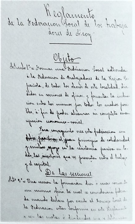 Esto último lo anuncia de manera clara el caso de Alcoy, donde en agosto de 1887-, sería [re]constituida públicamente la Federación local de Trabajadores, adherida a la nueva FTRE, y apoyada en el llamado Pacto de Unión y Solidaridad, encabezando varias huelgas de tejedores, obreros de la lana y papeleros durante 1889.