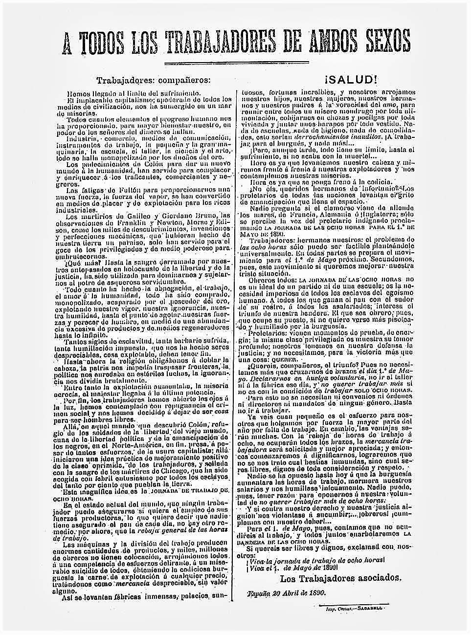 00_Hója_ A todos los trabajadores de ambos sexos, Los Trabajadores Asociados, España, 20 d’abril de 1890_Ateneu Enciclopèdic Popular
