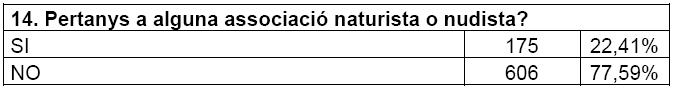 La 14 et demana si pertanys a alguna associació naturista o nudista: