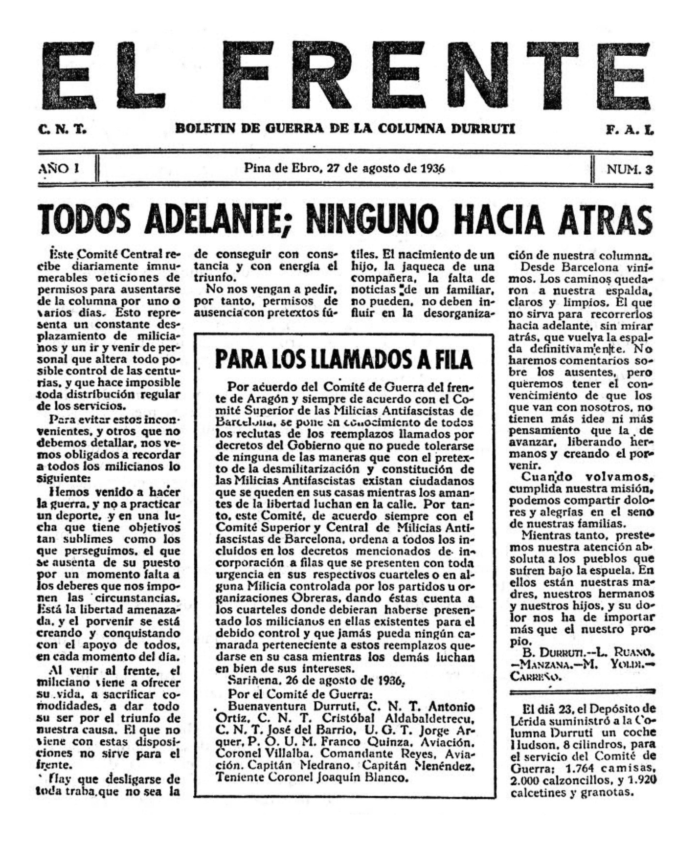 El 13 d’agost de 1936 surt a Pina de Ebro el primer número del periòdic setmanal anarquista El Frente. Boletín de Guerra de la Columna Durruti. CNT-FAI. A partir del número 75 portarà el subtítol «Boletín de Guerra de la División Durruti. CNT-FAI. Portavoz de la 26 División» i més tard «Órgano de la 26 División». Va estar dirigit per Francisco Carreño, Joan Ferrer i Ramón Liarte. Aquesta publicació s’imprimia al mateix front de guerra i es distribuïa gratuïtament als milicians de les trinxeres. Conté notes sobre sanitat, tècniques de guerra per a la tropa, discursos, fotos dels milicians, dibuixos, historietes, activitats culturals, concursos literaris i de dibuix, visites al front (SIA), etc. Hi van col·laborar Helios Gómez, Ángel Martín, A. Marin, B. Millas, Cañas, A. Fernández Saavedra, Juanonus, M. Román, Angel Flores, Ricard Sanz, R. Puig, Zapata, Floreal, M. Mula, Joaquín Morlanes, Tomàs Buil, Viñolas Roig, J. Call, Salvador Raja, José Riera, Emérito Aznar, Roque, Francisco García, Ricardo Rionda, Fernando Gil, M. Cubel, Juan S. Fenollar, Antonio Puerto, Carlos Ungría, A. Medina, Josep Pla Duix, E. Martínez Giménez, Andrés Monter, Francisco Piqueras, Antonio Sola, J. Solé, F. Vila, N. Gali Famada, Gil Roldán, A. Perez, Xarau, J. Del Amo, C. Subirats, Octavio Blanes, entre d’altres. L’últim número conegut és el 149, del 16 de gener de 1939.