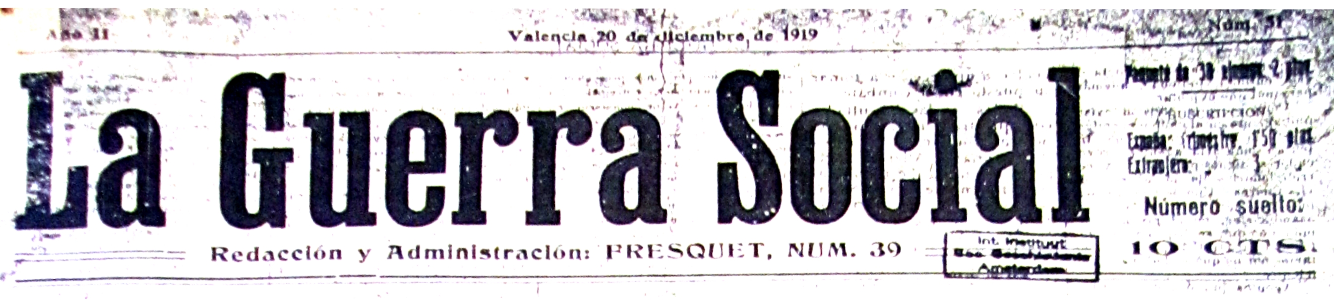 l 12 de desembre de 1915 va eixir a Elda el primer nùmero de La Guerra Social, periòdic anarquista i sindicalista. Va neixer per iniciativa de l’Antonio Loredo i per Eusebi Carbó arrán la seua arrivada a Elda la tardor de 1915 i per suposat, tenia el recoltzament de la societat de aparadores i sabaters La Racional d’Elda. No hi han quedat exemplars d’esta època. Sembla que es va editar a Elda fins el gener de 1916, i desprès va apareix a València [gen,1918 – gen,1920]. Aleshores anava subtitulat setmanari anarquista i fou dirigit molt probablement per Carbó. Va tenir una bona difussió nacional i internacional. Hi col·laboraren Gaston Leval, José Arranz, José Prat i d’altres. A la segona época, s’edità a Valencia, 1918-1920.