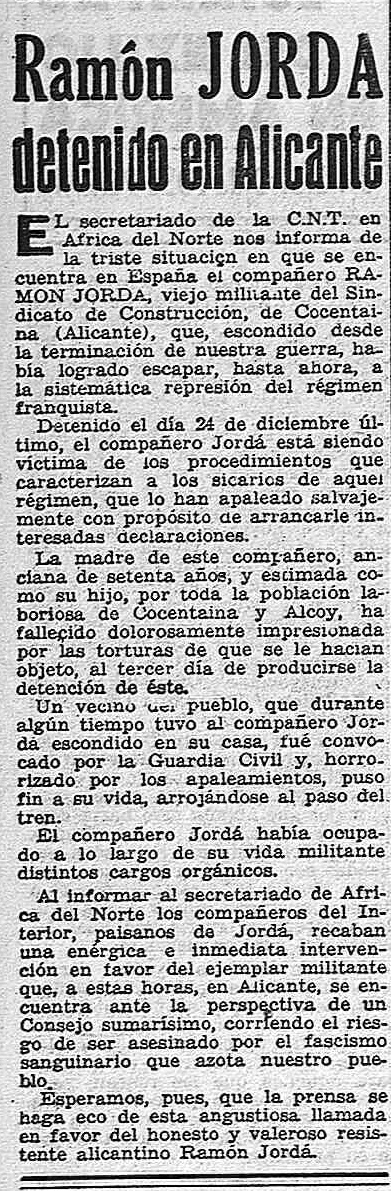l 24 de desembre de 1949 fou detingut per la guardia civil a Concentaina Ramón Jordá, que estava amagat a casa d’un company des del final de la guerra. Ramón era veterà militant confederal aviat integrat al sindicat de la Construcció de Cocentaina i abans de la guerra, militant de la CNT d’Alcoi, on col·laborà a Boletín, 1935. Desprès de la seua detenció, sa mare, una dona de 70 anys, davant l’estat físic del seu fill, torturat i empressonat a Alacant, va morir sobtadament; i la persona que acollí en sa casa al “topo” Jordá se va suicidar tirant-se a les víes del tren.
