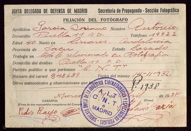 GALBIS MARTÍNEZ, PLÁCIDO: También Galbes. Mecánico-chofer en Madrid, afiliado a la CNT. Probablemente natural de Villena. Conductor de la Dirección General de Seguridad en los años republicanos. Durante la guerra, afiliado a SIA el 18-01-1938.
