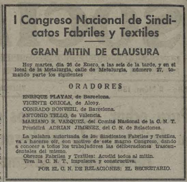 ORIOLA AZNAR, VICENTE: [Alcoi, 1901 / 1965]. También Oriols.Hilador mecánico de Alcoi, conocido por Orioleta, afiliado a CNT. Tomó la palabra en el mitin del Primero de Mayo de 1932 en Alcoi.Encarcelado varias veces en los años republicanos. Presidente del Sindicato de la Industria Fabril y Textil. Después del 19 de julio formó parte del CRD y se implicó en la socialización del ramo del Textil. También ocupó cargos de importancia en la Federación Regional y Nacional. Colabora a Ruta Confederal, 1937-38.Al frente del Comité de Abastos hasta 1939, cuando fue movilizado. Según algunas fuentes se encuadró en la GPA, ejerciendo su jefatura durante algún tiempo. Detenido al final de la guerra en Alcoi, 09-04-1939, y condenado en Alicante el 29-02-1940 a 30 años. Pasó por El Dueso y San Miguel de los Reyes. Salió en libertad condicional el 18-04-1944 y obtuvo el indulto el 24-07-1947. Reaparece entonces asumiendo cargos en el sindicato vertical franquista, pero de nuevo fue detenido el 06-12-1947, con otros compañeros, vinculados a la organización local clandestina de la CNT-FAI. Fue considerado el secretario comarcal. Salió en libertad el 04-02-1948. En 1955 miembro de la directiva de la Mutualidad de Levante.