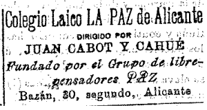 El 4 de enero de 1923 fallecía en Barcelona Juan Cabot y Cahué, republicano y librepensador afincado en Alicante. Marino federal nacido en Vilasar de Dalt en 1859, debió formarse en alguna de las escuelas laicas fundadas por Gabarró en Palamós, donde integraba un grupo librepensador en 1887 y fue iniciado en la masonería, Logia Redención. Llegado a Alicante como discípulo de Gabarró, se integró en el grupo Paz, donde fundó diversos periódicos -El Crisol- y desempeñó el cargo de director del colegio laico entre 1888 y 1897, momento en que volvió al mar, esta vez como capitán de marina mercante y para el resto de su vida, aunque también desde aquí realizó una intensa labor asociativa creando en Alicante la Asociación de Capitanes y Pilotos, o editando el semanario La Marina Mercante Española a partir de 1900, al frente de los cuales seguía en 1913. Fue siempre un activo masón vinculado en Alicante -al menos hasta 1918- a las logia Numancia y Constante Alona con el nombre simbólico de Magallanaes, aunque también aparece como director de El Alicantino Masón [1892-1893], periódico órgano de la masonería local pero que acogía los postulados del librepensamiento. Esto le llevo a ser procesado judicialmente y anatemizado por la iglesia, en ambos casos sin éxito aparente. Moderó su anticlericalismo y aparece en 1896 como uno de los fundadores del Ateneo Popular y también del Ateneo Científico y Literario de Alicante. Fue además de un convencido espiritista que colabora en la fundación y dirección de la sociedad de estudios psicológicos La Caridad en 1899 en la que permaneció muchos años, pero tuvo que abandonar el cargo de presidente en 1908 por sus repetidas ausencias. Establecido en Barcelona, se dedicó a su profesión y durante la primera guerra mundial corrió graves riesgos por la amenaza de los submarinos alemanes. Su hijo, Juan Cabot Vilar, que en 1908 aparecía en los círculos radicales, se sacaría el título de maestro poco después. Llegado el periodo republicano, padre e hijo, que ejercía entonces como maestro de la Escuela Libre de Terrassa, obtendrían la calificación honorífica de Maestros Laicos Históricos.