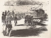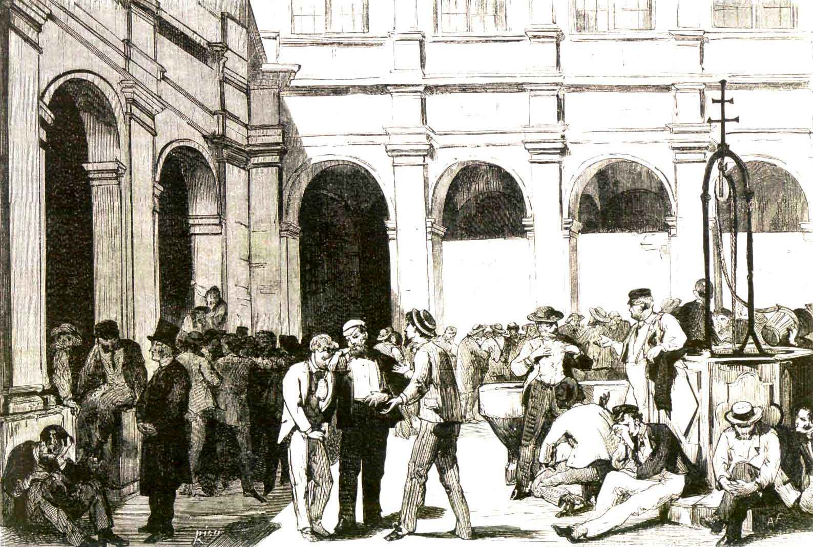 El 22 de enero de 1881 fueron excarcelados de la prisión de Alcoy, en libertad bajo fianza, 38 de los 39 presos previstos en la disposición del juez de distrito, los cuales estaban en prisión desde el año 1873, encarcelados a consecuencia de los sucesos de julio, conocidos como la Revolución del Petrolio. No llegó a tanto. En total se produjeron 16 muertos en los enfrentamientos, entre ellos solo un militar, respetándose la vida de los encarcelados durante esos días; y se incendiaron cinco inmuebles, ninguno de ellos industrial y solo contamos algún robo aislado. Entre los detenidos encontramos a internacionalistas y cantonales, pero también carlistas y delincuentes. La represión desatada tras aquellos sucesos, se concretó en detenciones en toda la comarca que se alargaron durante meses, muchos de ellos conducidos como animales hasta el Castillo de santa Bárbara de Alicante. Bastantes murieron en prisión, como sucedió con el número 39, al que esperaba en vano su familia a las puertas de la cárcel, rodeados de infinidad de parientes y amigos de todos los confinados. Tenían suerte si sus familias no habian acabado en la miseria o en la más completa desesperación, frente a la lentitud, imprevisión y la irregularidad de la administración de justicia de un sumario de alrededor de 20 mil folios. El proceso judicial duraría hasta 1884, cuando habrían sido puestos en libertad las dos terceras partes de los procesados, que incluía a 282 presentes y 56 ausentes. La prolongación del proceso llevó a algunos presos al suicidio, y a que se extendiera un clima local de solidaridad traducida en una sólida Comisión de Defensa de los Presos activa hasta 1884. En la imagen, los rehenes detenidos por los revolucionarios en el patio de la prisión según La Ilustración Española y Americana (01-08-1873). [+]