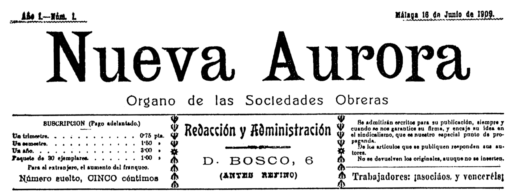 El 16 de juny de 1909 surt a Màlaga el primer número del periòdic quinzenal anarcosindicalista Nueva Aurora. Órgano de las sociedades obreras. Amb la seva publicació pretenia fer ressorgir la potent federació de societats obreres de resistència «El Faro de Andalucia», que arreplegava gairebé tot el proletariat andalús. El gerent en va ser Sebastian Navas i van col·laborar Acracio Progreso i Rafael Díaz, entre d’altres. Només van sortir dos números, l’últim el 30 de juny de 1909.