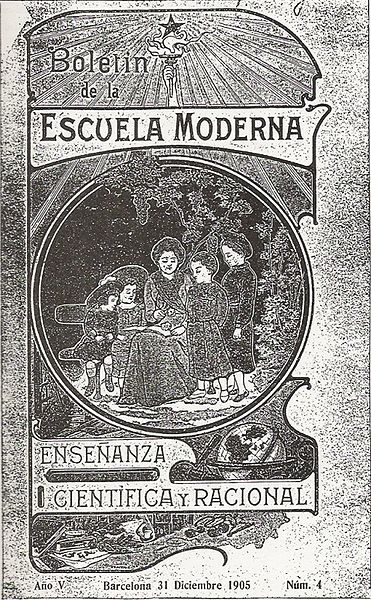 El 8 de octubre de 1901 se produce la fundación de la Escuela Moderna. Escuela, debida a la iniciativa de Francisco Ferrer Guardia y apoyada por eminentes pedagogos e intelectuales de la época. La escuela estaba enfocada a las necesidades del proletariado, para la alfabetización del pueblo y su preparación ante un futuro mediante una enseñanza libre de dogmas y basada en el respeto del alumno y en la aférrima creencia en el individuo y su desarrollo personal. Los niños y las niñas tendrán una insólita libertad, se realizarán ejercicios, juegos y esparcimientos al aire libre, se insistirá en el equilibrio con el entorno natural y con el medio, en la higiene personal y social, desaparecerán los exámenes y los premios y los castigos. Se hace especial atención al tema de la enseñanza de la higiene y al cuidado de la salud. Los alumnos visitarán centros de trabajo —las fábricas textiles de Sabadell, especialmente— y harán excursiones de exploración. Las redacciones y los comentarios de estas vivencias por parte de sus mismos protagonistas se convertirán en uno de los ejes del aprendizaje. Y esto se hará extensivo a las familias de los alumnos, mediante la organización de conferencias y charlas dominicales. Francisco Ferrer Guardia. Todo ello en tiempos donde la Iglesia tenía el monopolio de la enseñanza y perseguía y castigaba a los que, como Ferrer y otros, osaban desafiar su poder. Cerró en 1906, poco después Ferrer fue ejecutado por sedición por su falsa participación en los hechos de la Semana Trágica, lo cual llevaría a la realización de una campaña internacional contra de la sentencia. Actualmente los únicos archivos de la escuela son mantenidos en el departamento de colecciones especiales de la Universidad de California, San Diego.