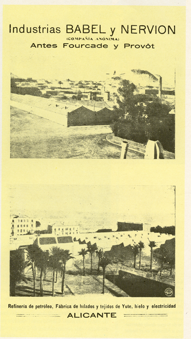 La empresa “Fourcade y Provot” -que en 1919 pasó a denominarse “Industrias Babel y Nervión”- era un complejo industrial, instalado en la finca “La Alicantina” de Babel desde fines del siglo XIX y consistente en una refinería de petróleo, una central eléctrica, una fábrica de hielo y una fábrica de hilados y tejidos de yute, en su mayoría sacos.