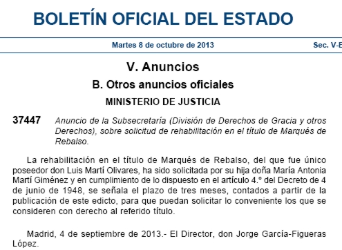 8Aunque los dos hijos del primer matrimonio de Luis Martí fallecieron de forma prematura, casó en segundas nupcias con Carmen Giménez Tulllols, fallecida en 1979, de la que debió nacer Antonia María. BOE 08-10-2013: Anuncio sobre solicitud de rehabilitación del título de marqués de Rebalso.