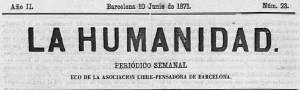 3La HUMANIDAD 03-02-1872. A pesar del anuncio, no consta que inauguraran aquella escuela, ni siquiera que llegara a celebrarse el I Congreso de Libre-Pensadores de la Región Española que anunciaban en este mismo número; como tampoco llegó a abrirse el llamado Ateneo Libre-Pensador; aunque sí otras iniciativas similares, ..“Les jeunes professeurs de Barcelone ont offert à la junte d’inanguer des cours d’instruction gratuits pour la classe ouvrière. L’offre a été acceptée..”, L. Combatz: Le Temps 20-10-1868. Hay que tener en cuenta que el párroco de Igualada entre 1859 y 1868, Ramón Sala y Fugurull [1823/1899], también paraba por Barcelona, donde publicó desde 1869 el semanario bilingüe católico El Domingo, cuyo lema era ..hacer bien a los hombres sin distinción de partidos. Ver, JUNYENT: Manuscrits verdaguerians de revelacions, exorcismes i visions. Llibretes de visions de Teresa. Editorial Barcino, Barcelona, 1994.