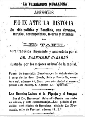 TAXIL, LEO: Pío IX ante la historia: su vida política y pontificia, sus devaneos, intrigas, destemplanzas, locuras y crímenes. Traducida del francés, aumentada e iluminada por el Dr. B. Gabarró y Borras. Librería Libre-Pensadora, Barcelona, 1884. Para instrucción democrática.