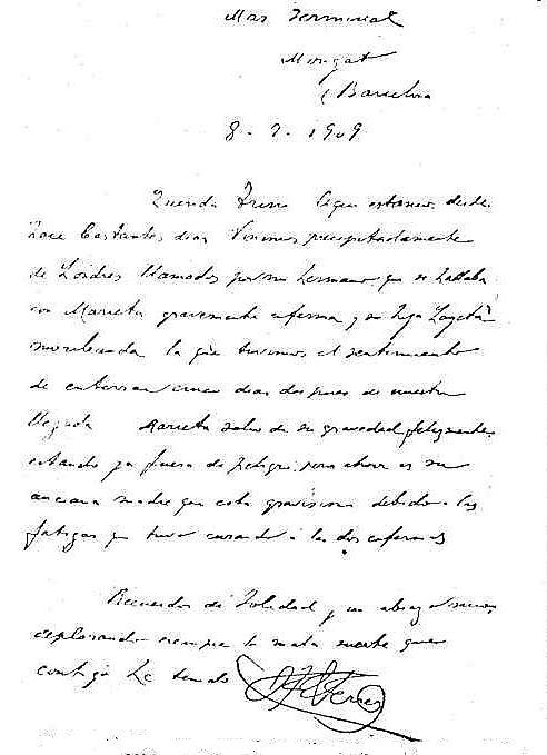 - 5FERRER Guardia, Francisco: Testamento, del 13 de octubre de 1909. En Londres recibiría FG la carta de su hermana informándole del grave estado de su sobrina, por lo que decidió volver de forma súbita a Barcelona.Ver, Causa contra Mateo Morral, Francisco Ferrer, José Nakens, Pedro Mayoral, Aquilino Martínez, Isidro Ibarra, Bernardo Mata y Concepción Pérez Cuesta [1906-1909]. Sucesores de J. A. García, 1911, Vol. 2, p. 371; Vol. 3, pp. 70-71. También, La Lanterne 09-06-1907.