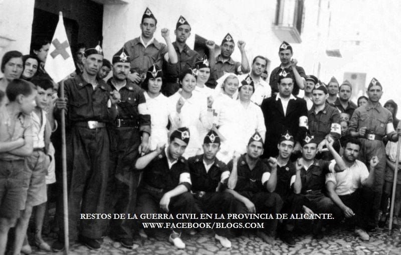 Voluntarios de la C.N.T y voluntarias de la Cruz Roja, en el cuartel de la C.N.T de Elda 1936