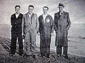 0_Federico García Lorca en la playa del Postiguet en el invierno de 1932 A su izquierda Gastón Castelló_ A la derecha de Lorca José Juan Pérez, músico y Antonio Blanca