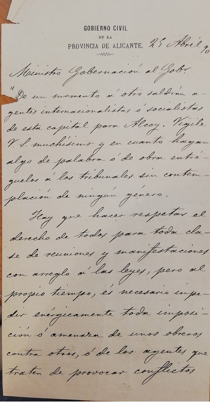 Alcoi mayo 1890 – Manifestaciones – Circular Gobierno Civil Alicante 25-04_bis