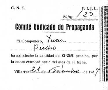 La CNT, apenas conocida antes del 19 de julio, experimentaba en la provincia una notable afiliación y a menudo prescindía de la estrecha legalidad republicana, cosas ambas que causaban tensiones con la UGT, antaño mayoritaria. Que el tema preocupaba quedó demostrado en el mitin cenetista del 3 de septiembre de Castellón, donde José España, Joaquín Cortés y Juan López hablaron a favor de la actuación conjunta con la central socialista pero también de la necesidad de acabar con el caciquismo político de los partidos, que en la provincia no podían ser más que el PSOE e IR. Cortés dijo que no era el momento del Comunismo Libertario, posición oficial de la CNT, pero en absoluto de la mayoría de sus militantes. Juan López reclamó un Consejo Económico levantino a imagen del que existía en Cataluña y la entrega a los obreros de la propiedad abandonada en manos de los Comités de Defensa locales. Se imponían nuevos rumbos en la economía y la socialización de los medios de producción era el único medio capaz de detener su desorganización. Peidro conoció a Cortés en uno de sus viajes a Valencia “a portar papers”, y se reunió con él. Su idea era la de llevar oradores a Vila-Real para orientar a los recién afiliados y atraer a los simpatizantes, principalmente obreros del campo. Regresó con José España, conocedor del problema campesino, y éste dio en el cine los XIII, rebautizado “Salón CNT Francisco Ascaso”, una conferencia sobre “Los campesinos ante la Revolución”: