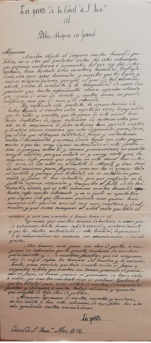 Hoja – Los Presos de 1873 al Público Alcoyano – septiembre 1876 – 1