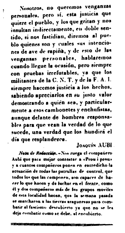 Deixem un enllaç per consultar aquest treball d’en Manel Aisa, que ens parla d’un obrer fogoner badaloní, Donato Murciano Argilés, que passà per les presons de la Dictadura i la República, visqué sempre en la clandestinitat i finalment va esdevenir membre de les Patrulles de Control en els anys de guerra, adscrit al grup encapçalat pel tèrbol Joaquim Aubi Casals. Al voltant del tema de la violència revolucionaria i l’anarquisme, ens venen al cap les següents paraules d’en Joan Peiró, vidrier badaloní que finalitzà els seus dies com en Donato, es a dir, afusellat pels franquistes.