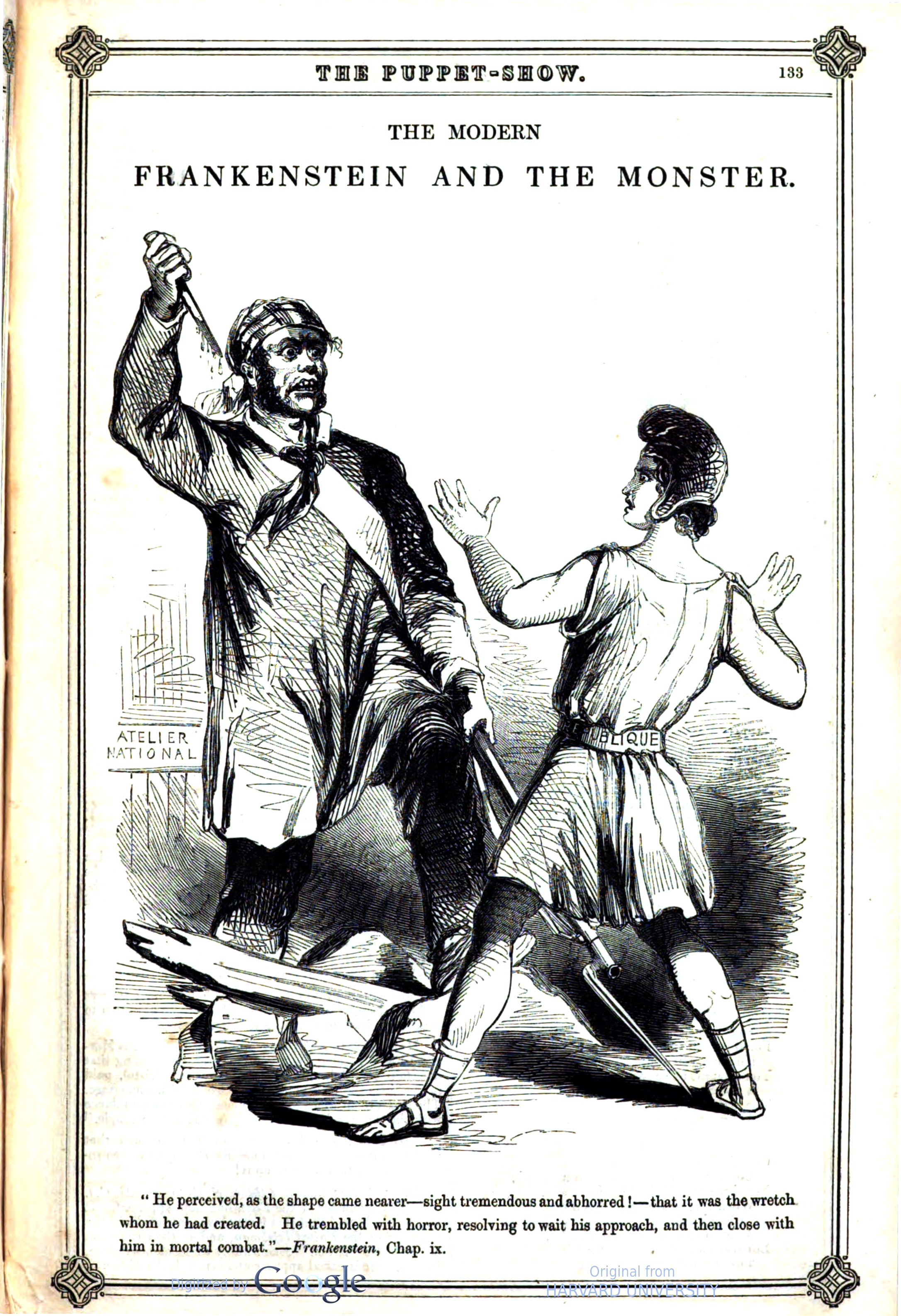 Tras esta visita al inframundo de la cultura obrera, reflejada en las páginas de Frankenstein, podemos entender mejor por qué el protagonista no tiene nombre y, sobre todo, por qué tuvo de ser publicada de forma anónima en 1818, lo que se repitió en Francia, 1821. Lo que podía parecer un mero accidente editorial por ser la autora una mujer, cobra significado por el mensaje político de la novela, que parece ahora mucho más claro tras la visita del mundo de sombras en que se movía Corréard, agitador y precursor de la clase obrera.